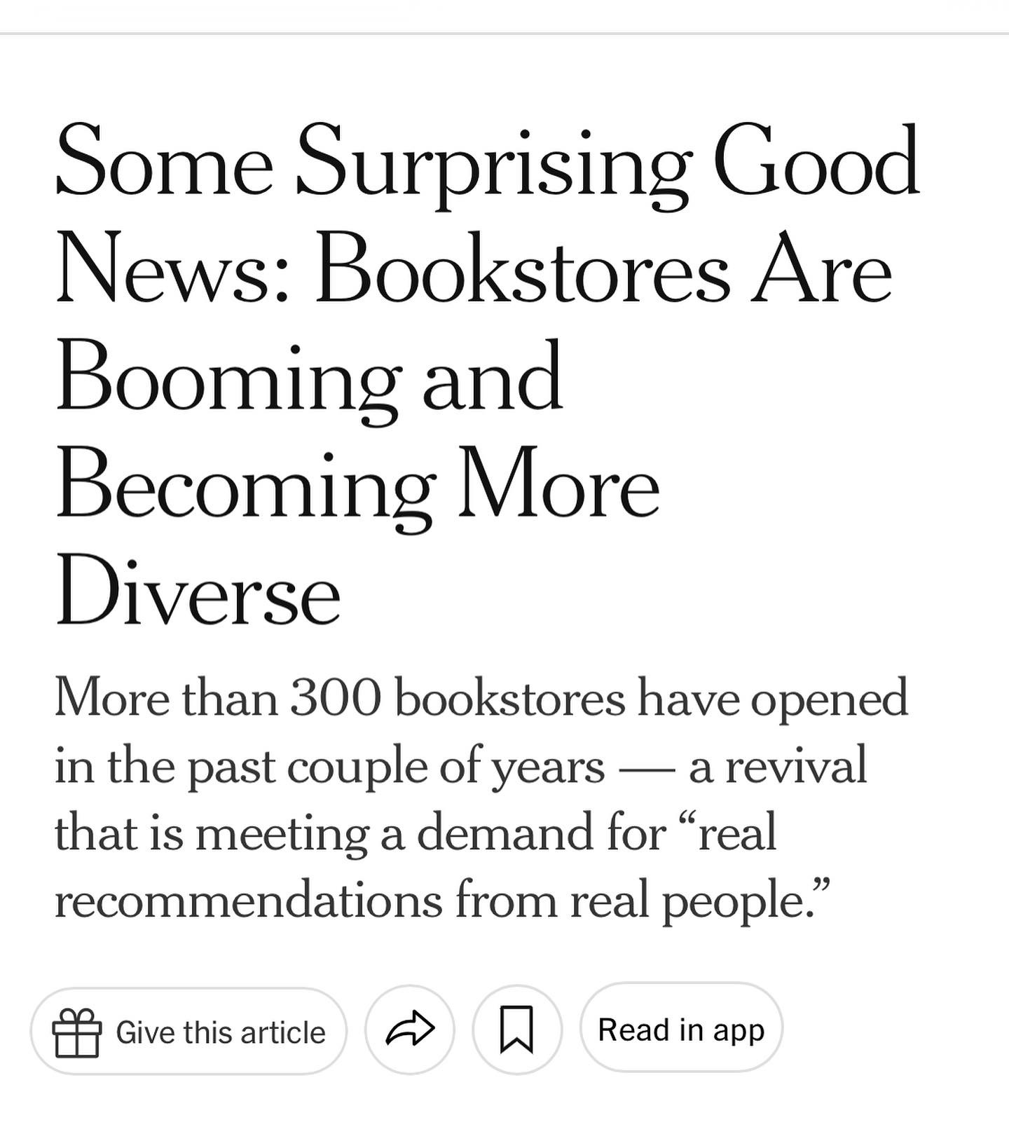 PS:🚨Different online headline: “Some Surprising Good News: Bookstores Are Booming and Becoming More Diverse.” A bit better.