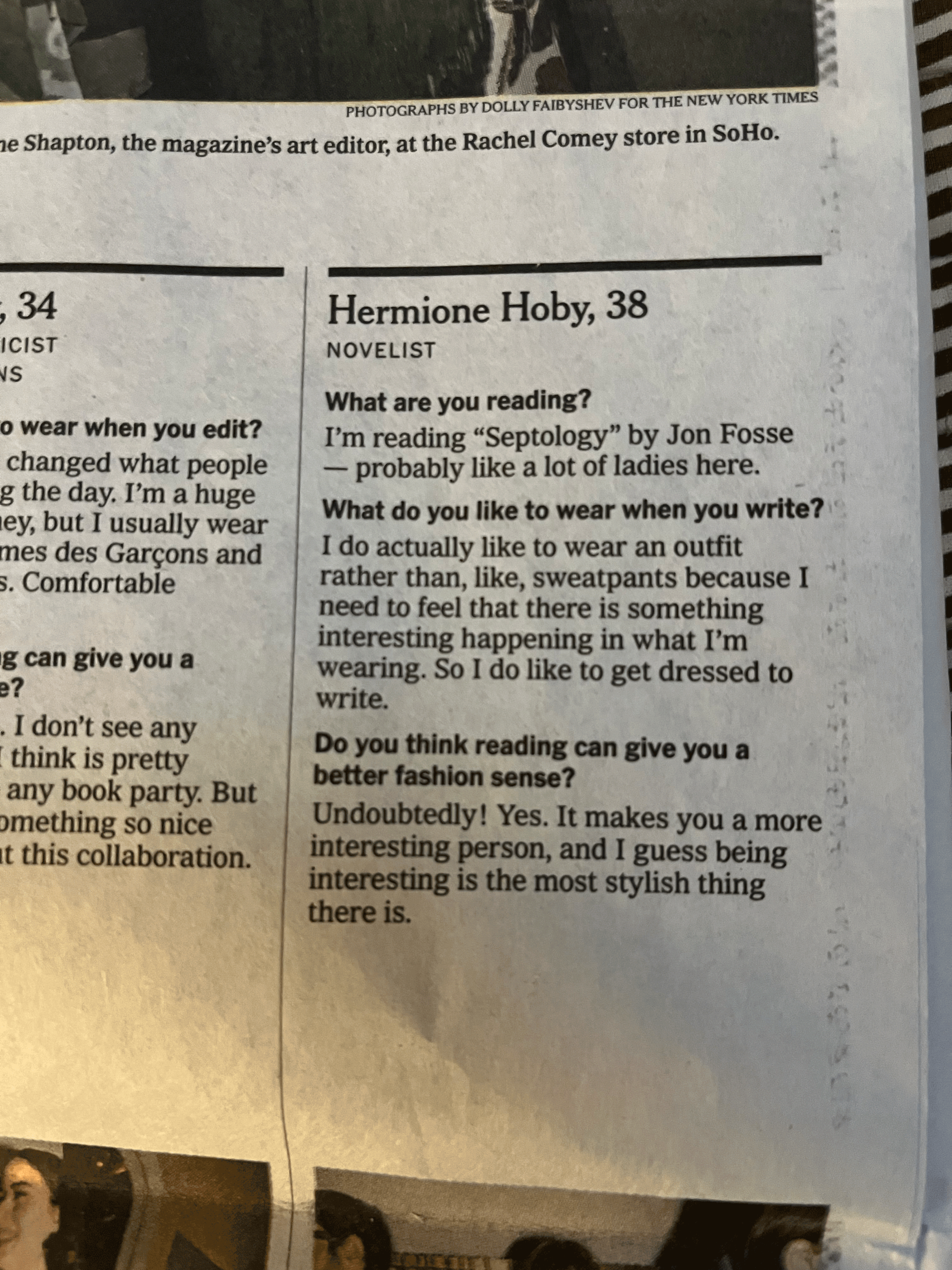 Spotted this in Sunday’s NYT: ‘Literature and Fashion, Together in Harmony.’ The SoHo store for designer Rachel Comey was the setting for a reading by memoirist Vivian Gornick; the thrust of this lighthearted piece was how fashion and literature might intertwine. I say “lighthearted” because it obviously is, but I do love the ways that “literature” might be paired with other, unexpected things.