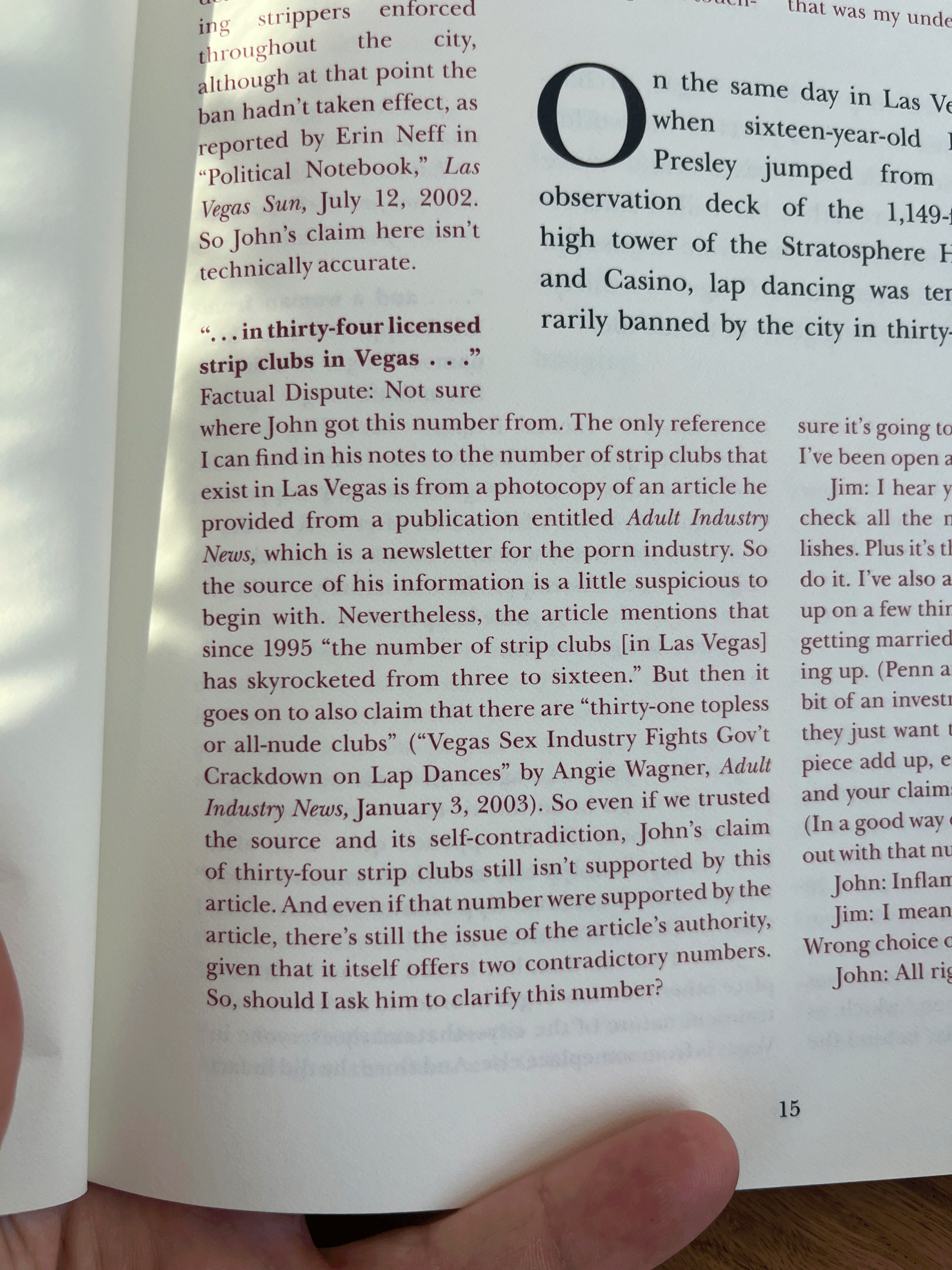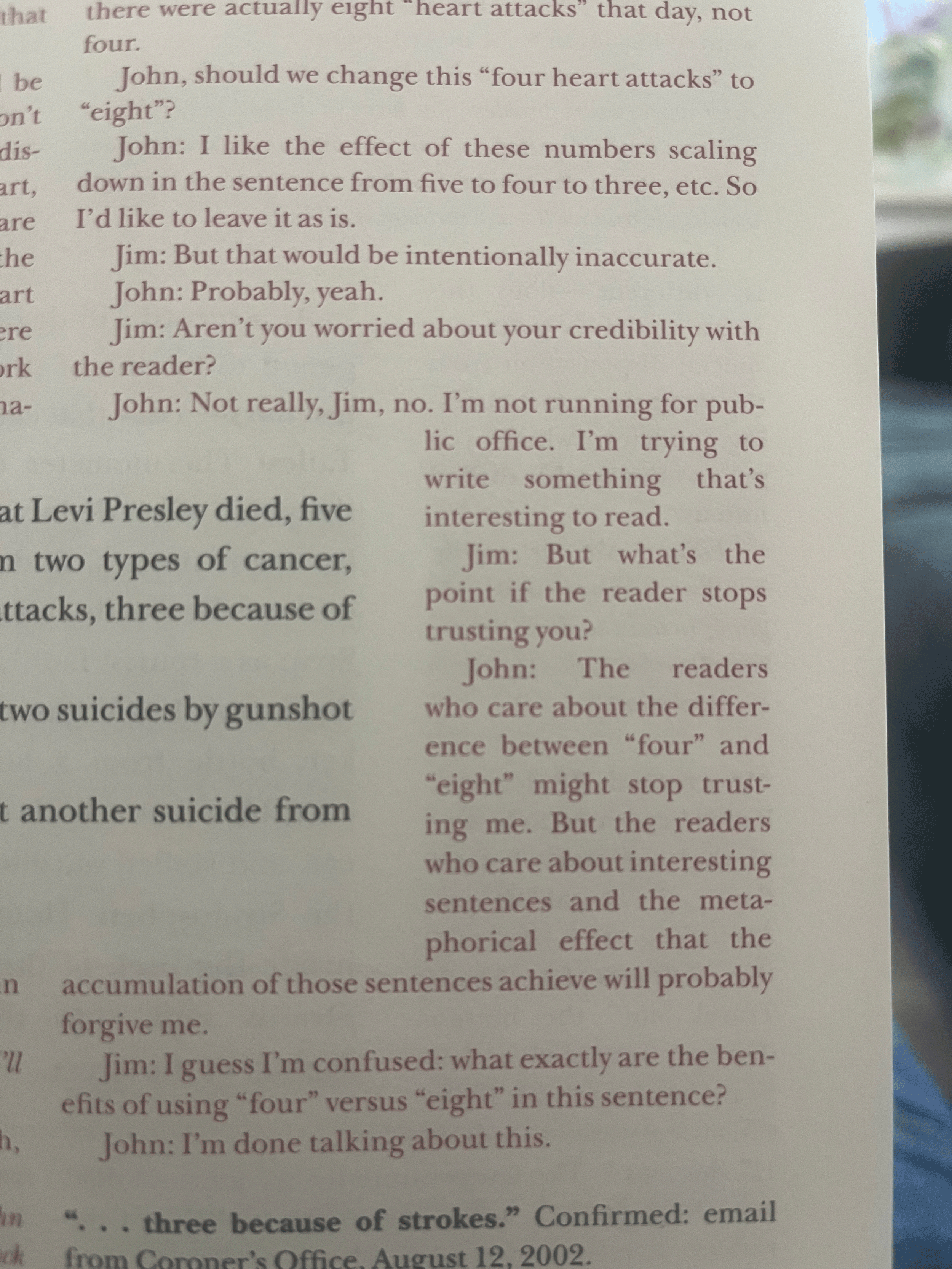 Jim: “Note to self: John is not a journalist. Also not a nonfiction writer. He is, however, a writer of journalistic-ish texts that are not necessarily fiction. Got it.”
